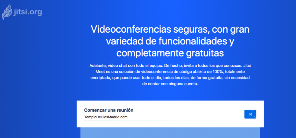 Hemos creado una habitación en la plataforma meet.jit que nos va a permitir reunirnos en cualquier momento. La habitación se llama TemploDeDiosMadrid.com y para entrar es tan sencillo como pulsar en este enlace o navegando a la plataforma y poniendo el nombre de la sala, TemploDeDiosMadrid.com (recordar que las mayúsculas y las minúsculas con importantes).